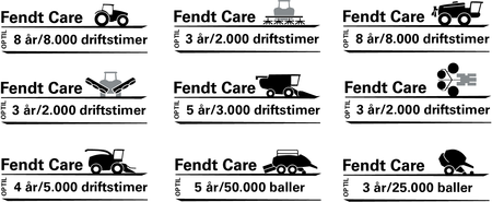 Fendt står for kvalitet, lang levetid og optimal ejertidsøkonomi. Når du køber en fabriksny Fendt-traktor, er der f.eks. altid 1+3 års eller 3.000 timers garanti alt efter, hvad der indtræffer først. Og hvis du ønsker maksimal tryghed i maskinbudgettet, kan perioden og timerne forøges som tilkøb. Du kan også tilkøbe udvidet garanti med Fendt Care på vores andre produkter. Varighed og antal driftstimer - eller for pressernes vedkommende antal baller – kan varieres efter behov.